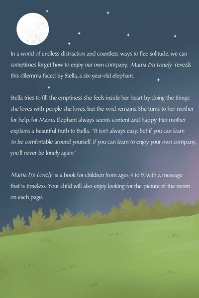 Mama, I'm Lonelyis a book for children from ages 4 to 9, with a message that is timeless. Your child will also enjoy looking for the picture of the moon on each page.