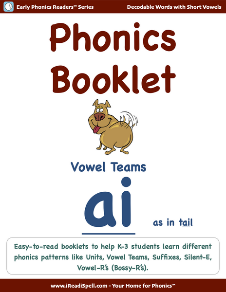 ee (bee); ay (ray); oo (long as in moon); oo (short as in good); ea (eat, ear, eal) - 3 booklets; aw (draw); ow (grow); ow (cow); ai (rain) - 2 booklets; oy (toy); oi (boil)